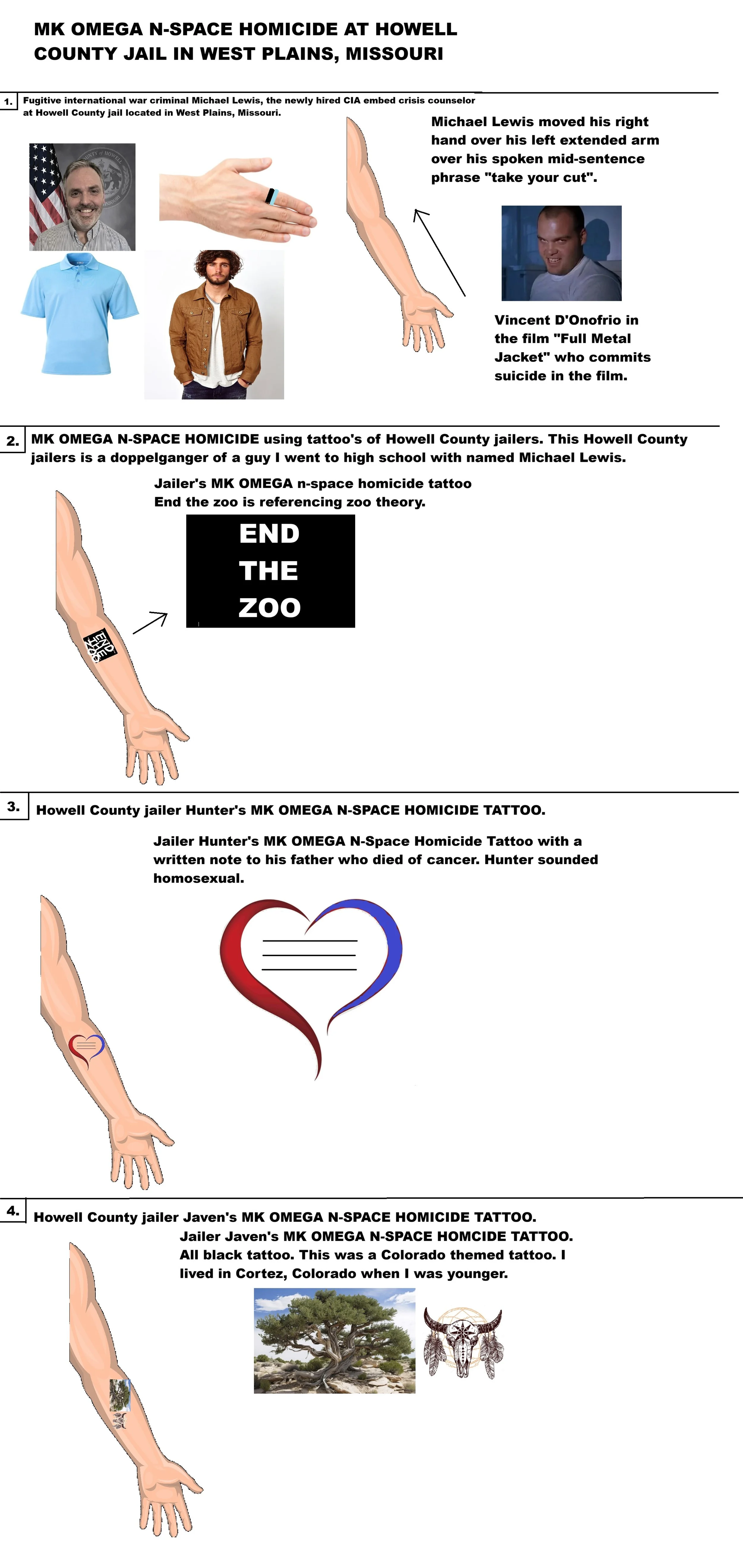 I have been barely able to survive up to this point with having to be rushed to the emergency room twice for emergency EKG tests and stabilization. They have told me that I am dying of oral gange tooth cancer and blood cancer and only have 6 weeks to 5 months to live. They have repeatedly told me since I have been imprisoned that I am galapitated and later told me the term meant I have low blood oxygen levels from cancer, chemical poisoning, and combat stress fatigue. The sonic audiogram logs will prove that they have told me they chemically poisoned me with methamphetamine, meth salts, a lemonade cocktail they later said meant meth juice, lithium, remerol, prevlar, mescaline, and put a CIA nano particle in my medication, food, and water supplies. They said they also poisoned me to increase my “specific porosity”, a term they later defined as the linings of your veins and arteries in order to induce heart failure. They have told me that they are keeping me set for a life extension, a spare body, to be raped, skinned, and dismembered in the body of a gerbil, female prostitute, or female transexual. They have claimed to erase my memories in the near future. They said former President Obama gave them the idea of bombing me with a hellcat missile in my Missouri family home and that they have already done this later this month. They have repeatedly said to me “You catch a cat!” referring to a missile strike on family property. They have claimed that they were paid one billion dollars to set up and send me to an insane asylum in Laguardia, Texas as as well as Chicago. They have told me they will “break” me there. They said that they spend $500,000,000 a day on their operation around me. For years they have told me they wear orange sherbet jumpsuits in my subliminal awareness to program me into a false imprisonment by long term priming my brain with MK Alpha general programming. The United States government stole a over $14,700,000,000 drone account from me which is the largest account in the world that I was going to use to fund my objectives in humanitarianism and philanthropy. It was only $2500 I didn’t have for myself to afford bail. I couldn’t afford that because I am forced to live at the poverty level. I never had the money or family to get a proper civil award from the rape, torture, and human rights abuse from the United States government including the CIA and the the FBI. Also NBC news, CNN news, and every other fugitive international war criminal individiual or entity. My sentence by the Americans is the same as it was in 2012 when a CIA female officer embed as a therapy director at Mercy Hospital Springfield Marian Center A Unit shouted “It takes six months to make a ho!” as well as 2017 of a failed president Trump authorized extrajudicial state sponsored homicide. Get the recorded evidence of my entire stay at West Plains police department, West Plains jail, and the Howell County jail. This includes body camera footage during and after my illegal detainment and both jails camera systems. Also get what is called the sonic audiogram logs. The sonic audiogram logs are the recorded and transcribed audio and video evidence of the voice to skull microwave radiation directed energy weapon system used on me breaking the rules of engagement since 2016. You must get the sonic audiogram logs to properly ID all fugitive war criminals. Proof of these logs existence can be found by watching the December 2020 Presidential press briefing event with President Biden whom I have been told has had an active death warrant out for me for the past several years. In the December 2020 press briefing event, a male reporter who sat in the front row asked President Biden as the President was walking off of stage after the event “Mr. President? Did you hear everything Tyler Murphy heard in his head today?” The President responded, I was told by his electronic contact lenses trying to get public votes off of me by saying “Tyler knows we need a good President”. There was an MK Omega n-space homicide maneuver performed on me here on Monday, November 27th, 2023 by an embedded new crisis counselor named Michael Lewis. Subpoena the tape of this first visit. Michael was a doppelganger of the male actor Vicent D’Onofrio, an actor seen in the movie killing his drill sergeant and then committing suicide. Michael also wore two rings on his right index finger which is a strange place to put rings. The ring closest to the end of his finger was a teal blue color. The other ring he wore on his right index finger that was stacked closest to his palm was a black colored ring used for long term memory setting utilizing black lighting which takes advantage of the black you see every time you blink your eyes. Michael started talking and waved his hands in the air in a pattern and then motioned with his right hand down the underside of his left wrist over his spoken words of “take your cut”.